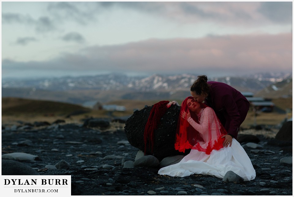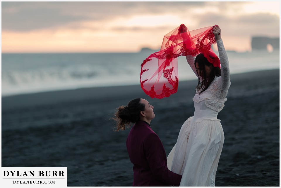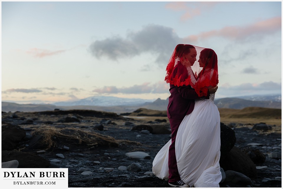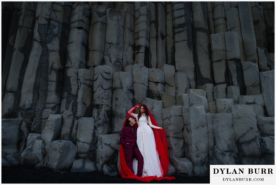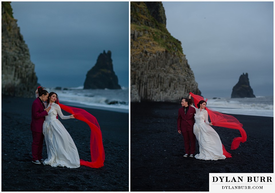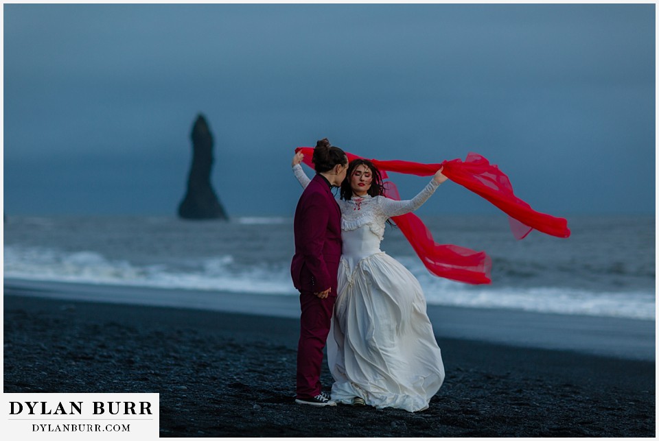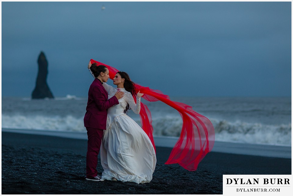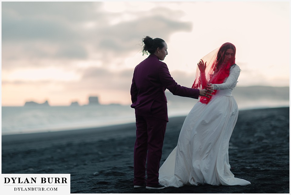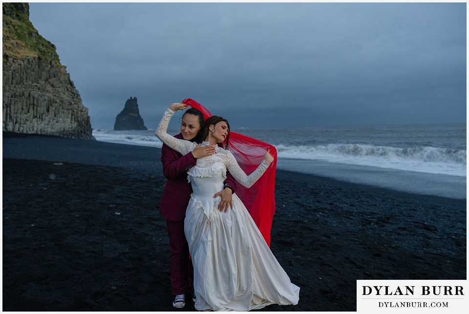 End your elopement day on Iceland’s dramatic southern coast at Reynisfjara Beach, located just outside the village of Vík. This lesser-known black sand beach offers moody cliffs, crashing waves, and a sense of wild isolation. Jas and Lauren changed it up for the beach with a stark red veil and necklace and gloves with red jeweled accents and nails. The look paired so well with the sunset glow, the stark black sand beach, and the basalt columns.
