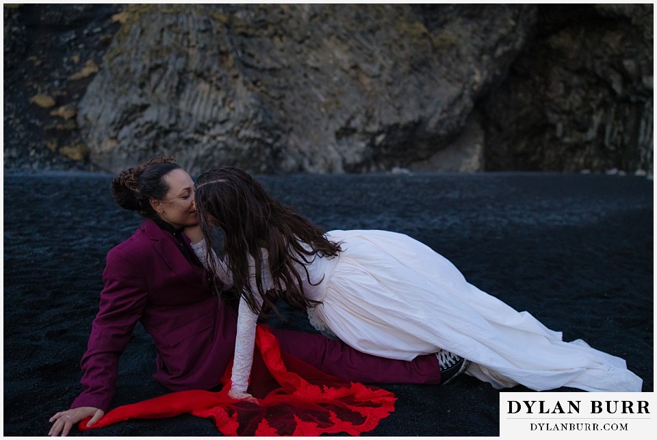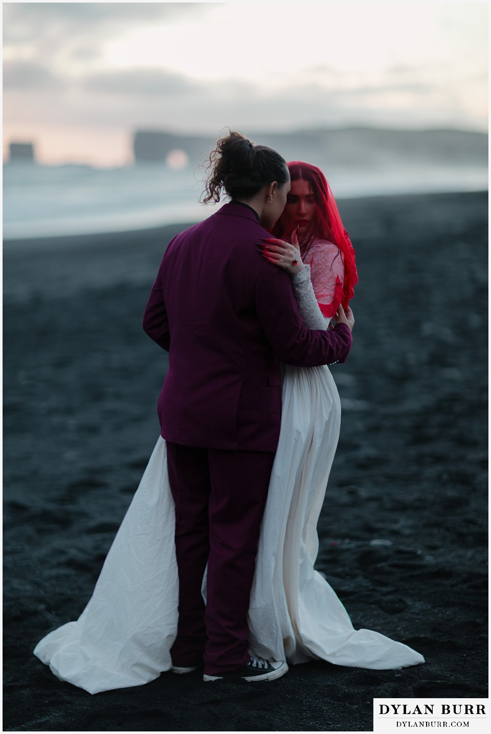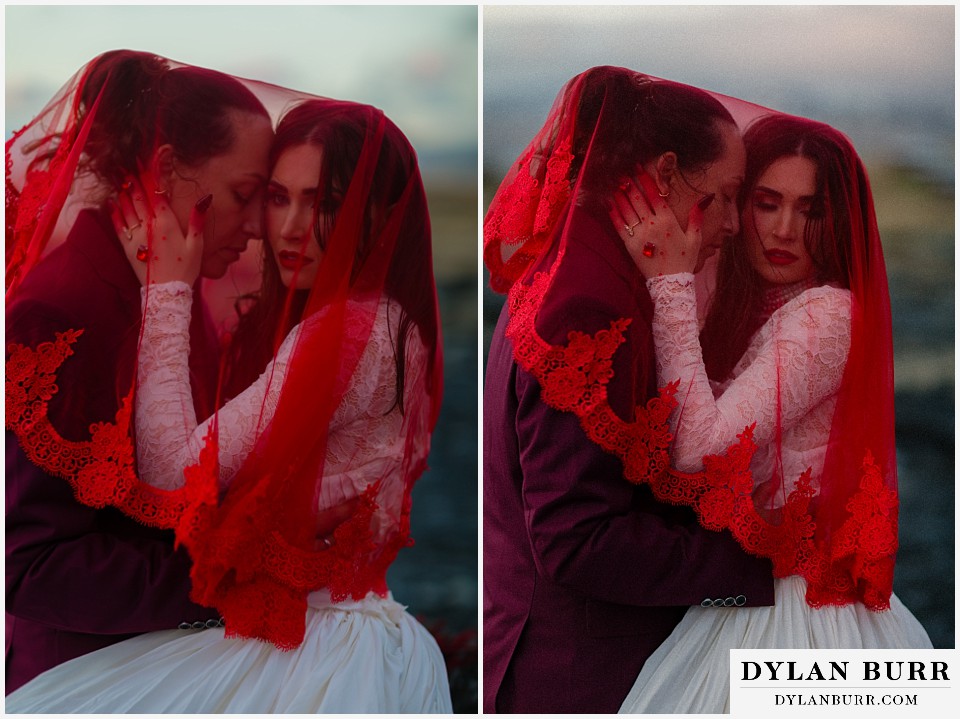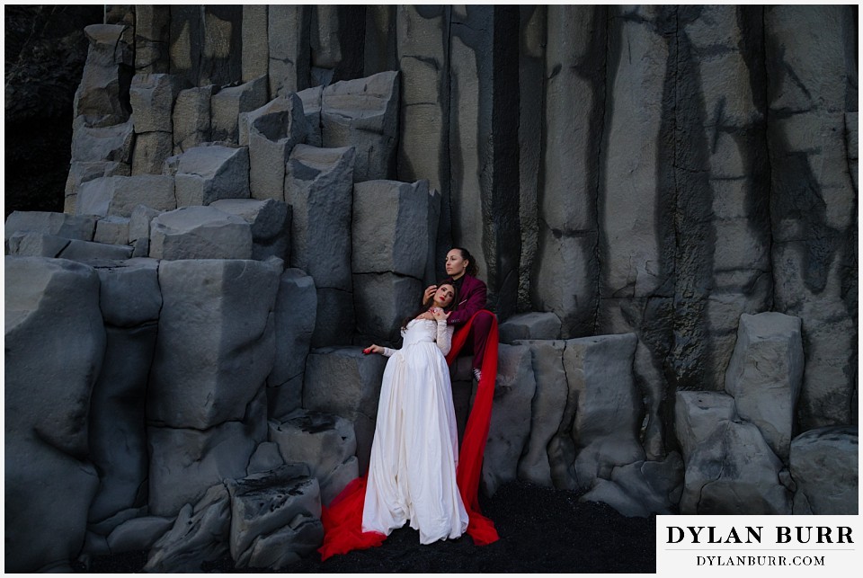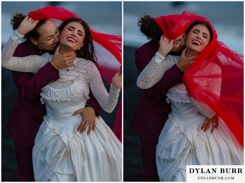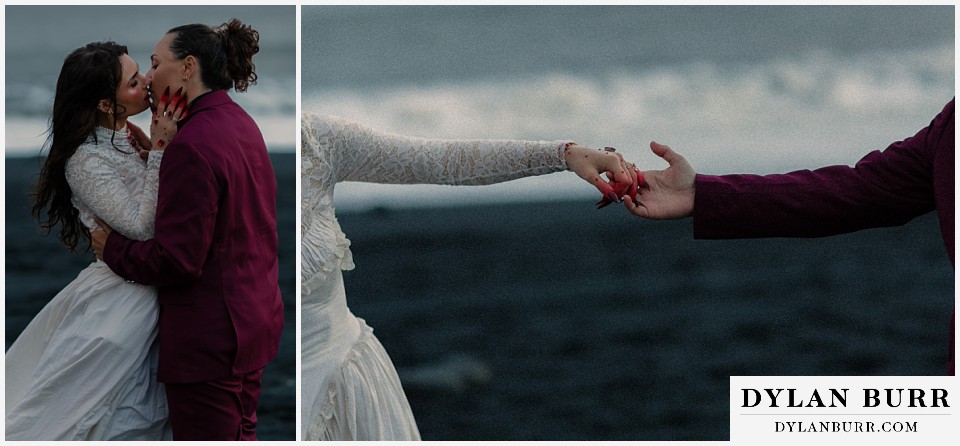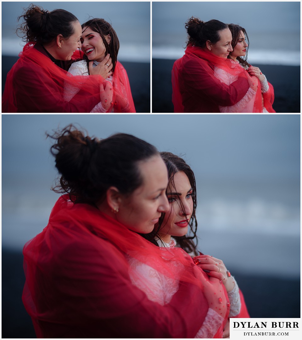 End your elopement day on Iceland’s dramatic southern coast at Reynisfjara Beach, located just outside the village of Vík. This lesser-known black sand beach offers moody cliffs, crashing waves, and a sense of wild isolation. Jas and Lauren changed it up for the beach with a stark red veil and necklace and gloves with red jeweled accents and nails. The look paired so well with the sunset glow, the stark black sand beach, and the basalt columns.