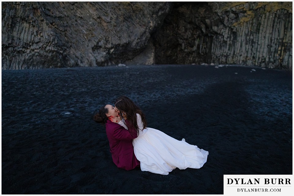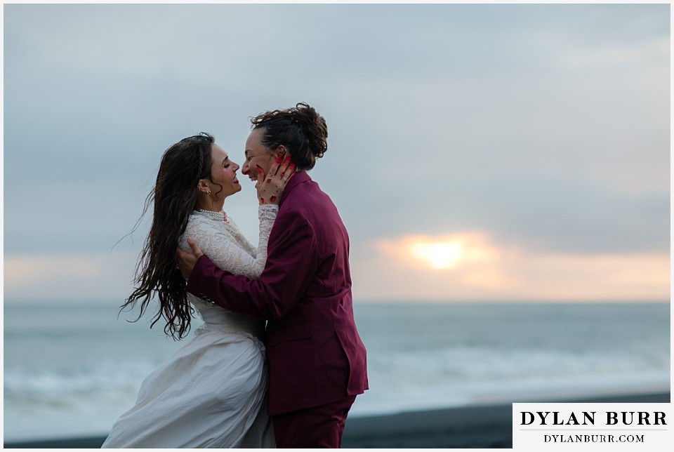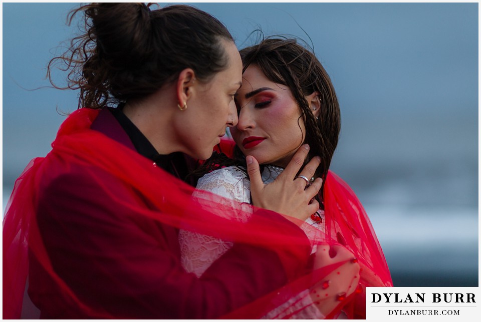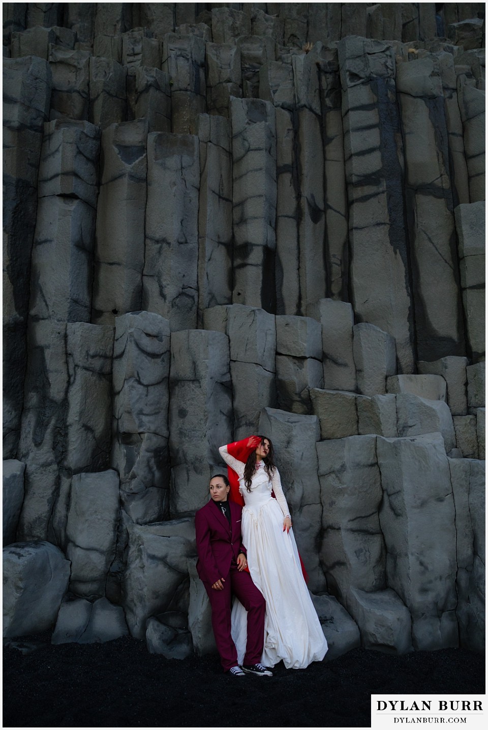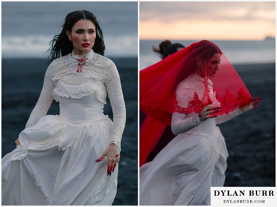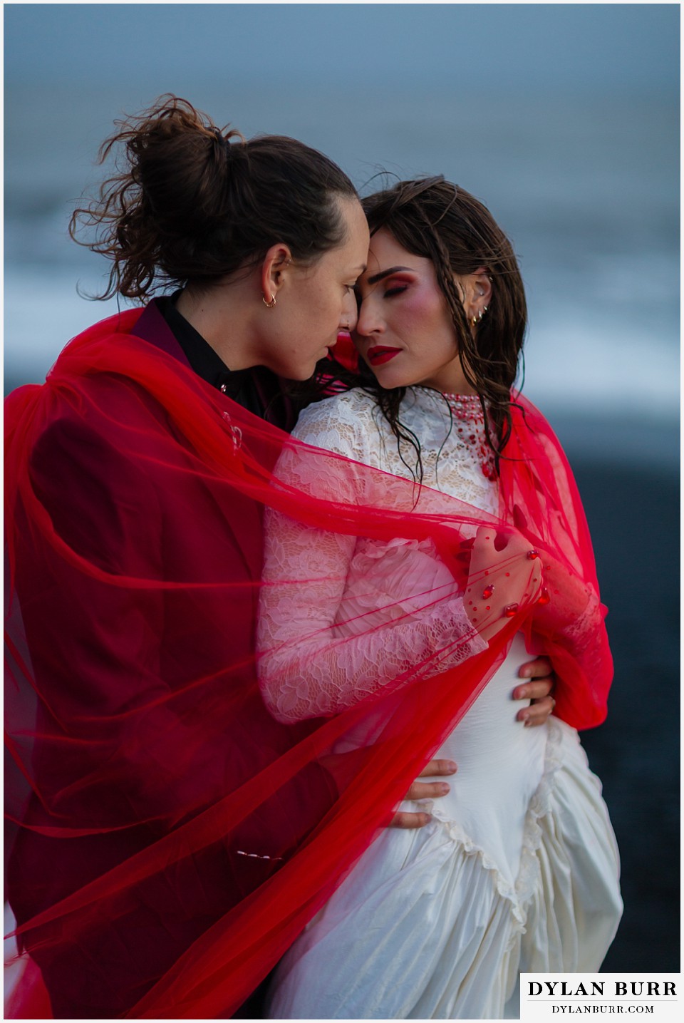 End your elopement day on Iceland’s dramatic southern coast at Reynisfjara Beach, located just outside the village of Vík. This lesser-known black sand beach offers moody cliffs, crashing waves, and a sense of wild isolation. Jas and Lauren changed it up for the beach with a stark red veil and necklace and gloves with red jeweled accents and nails. The look paired so well with the sunset glow, the stark black sand beach, and the basalt columns.