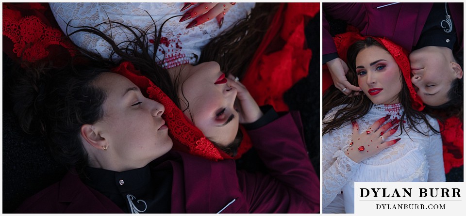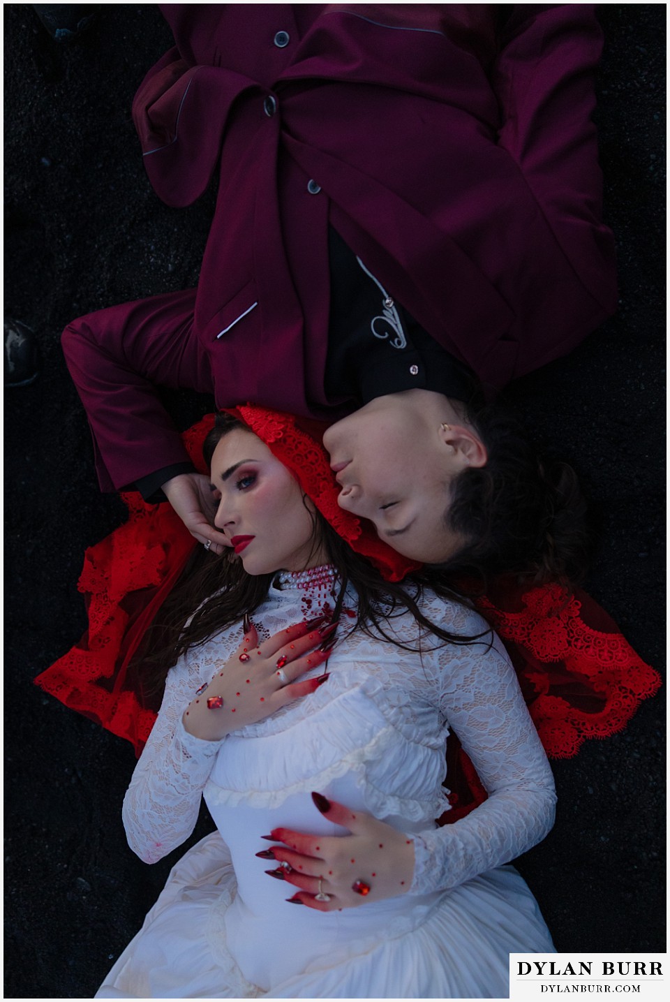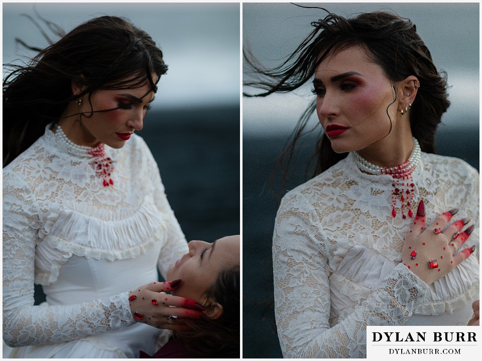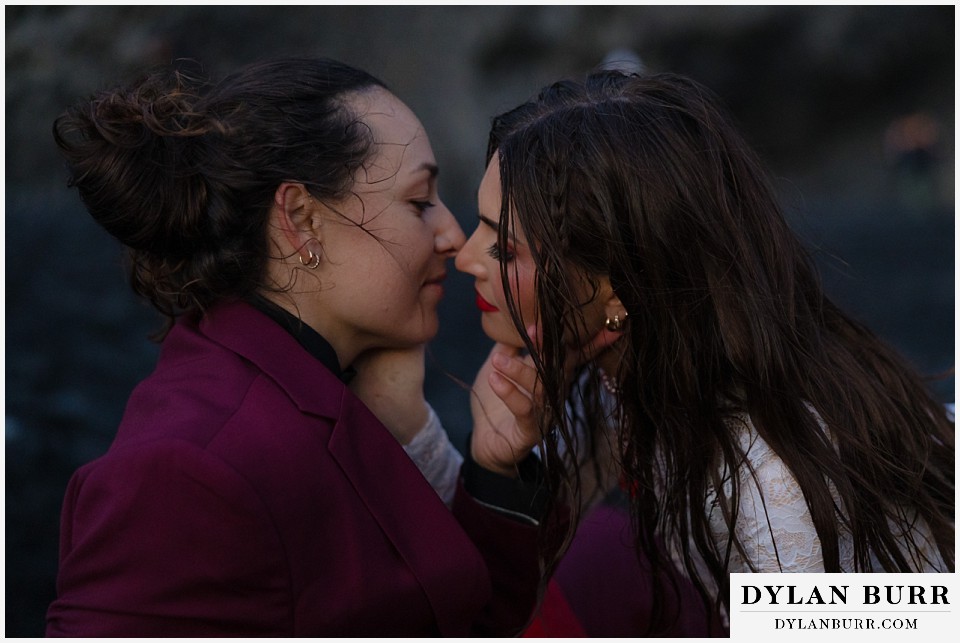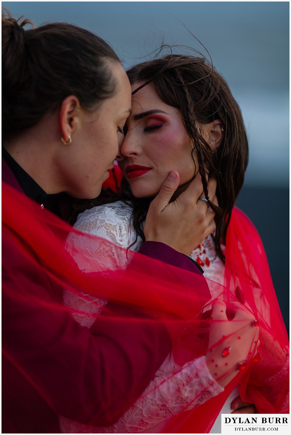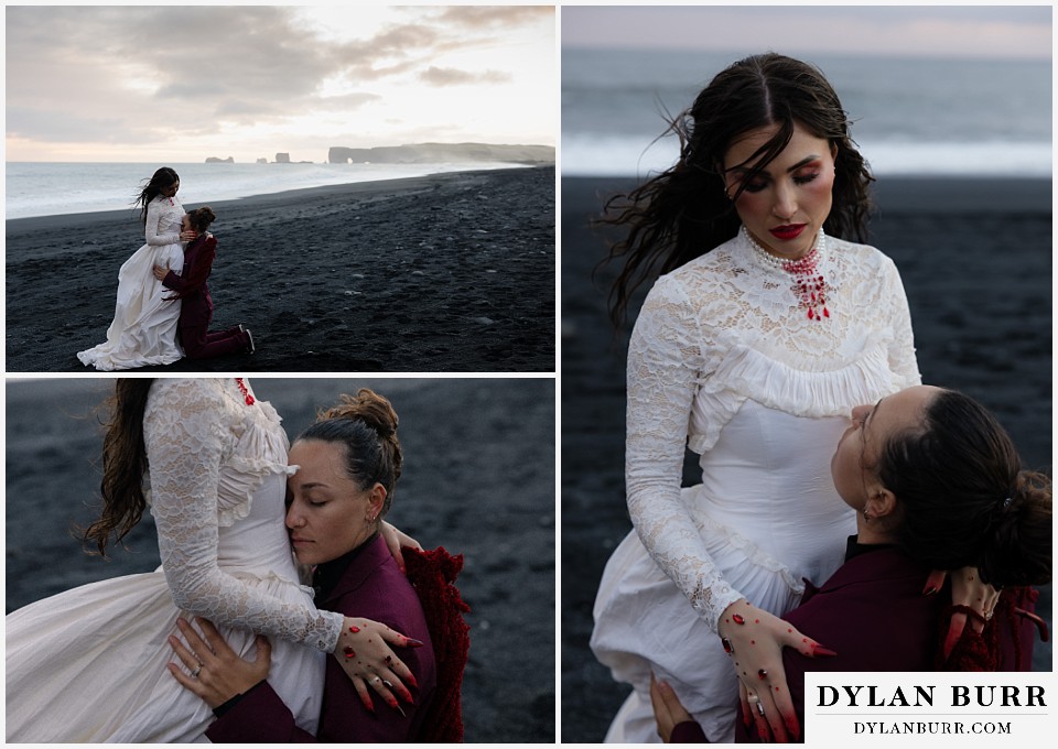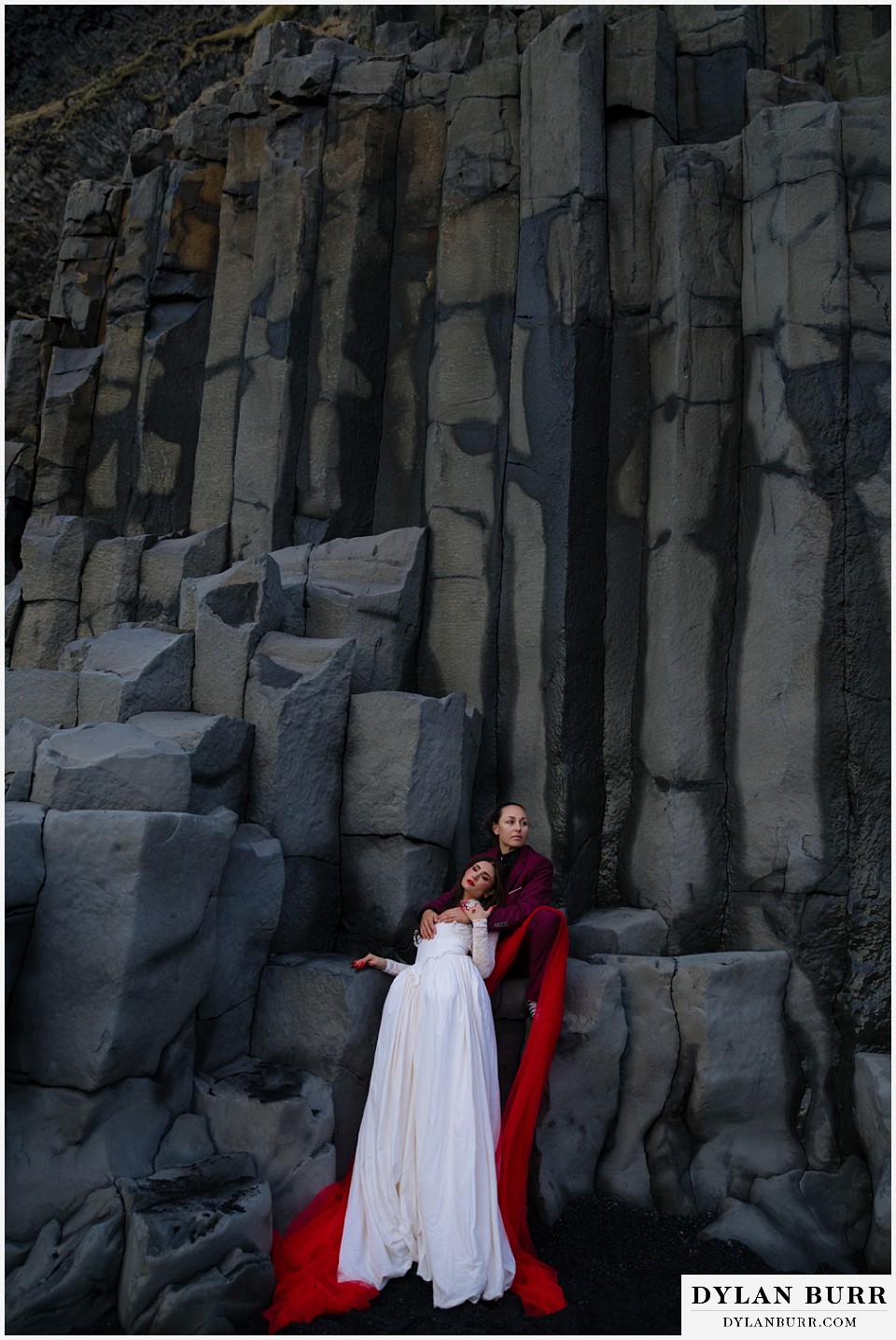 End your elopement day on Iceland’s dramatic southern coast at Reynisfjara Beach, located just outside the village of Vík. This lesser-known black sand beach offers moody cliffs, crashing waves, and a sense of wild isolation. Jas and Lauren changed it up for the beach with a stark red veil and necklace and gloves with red jeweled accents and nails. The look paired so well with the sunset glow, the stark black sand beach, and the basalt columns.